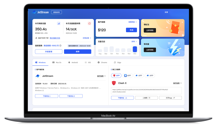 JetstreamVPN 支持标准化订阅协议(Clash / V2Ray 形式),